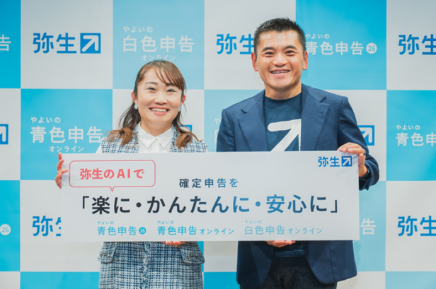 確定申告を“楽に・かんたんに・安心に” キンタロー。さん(左)が体感。右は弥生 代表取締役 社長執行役員 兼 CEO 武藤健一郎氏