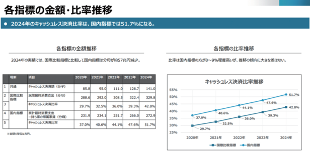 経済産業省では2025年10月に、キャッシュレス推進検討会をスタートさせた。同検討会では、2024年のキャッシュレス決済比率を新指標で51.7%と発表した(図1)。従来の「持ち家(帰属家賃)」を含めた計算を見直し、中間目標の2030年に65%、将来的に80%の達成を目指すとしている。2030~2035年という中間目標の達成年次の設定については、BIS(国際決済銀行)のデータを参考にしたそうだ。