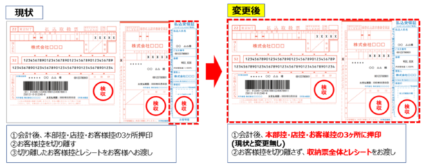 総務省通知により収納関係書類(収納票控え等)の保管見直しが可能となったことを受け、①収納関係書類の店舗・本部における電磁式データによる保管、②収納機関とのデータ連携・照合手順の見直し、③書類保管廃止による店舗オペレーションの簡素化(マニュアル改訂・教育見直し)、を行う。